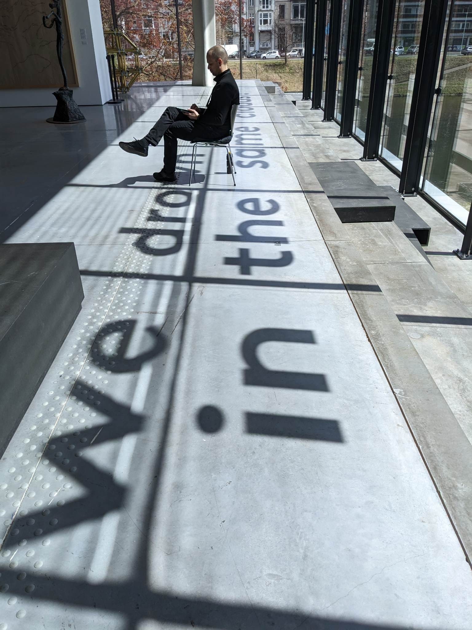 Während Effizienz, Erfolg oder Leistung in unserer Gesellschaft als Zeichen von Verlässlichkeit mit Stolz getragen werden, ist es nicht immer einfach, unsere Grenzen und Unsicherheiten öffentlich zu zeigen. Das Kunstwerk von Alicia Kremser verwandelt den Ausstellungsraum, das Museum, in einen Ort der Offenheit und der geteilten Intimität. Ein einfacher Satz, der durch Sonnenlicht aktiviert wird; ein Schatten, der jeden Tag auftaucht und wieder verschwindet, der mit der Architektur verschmilzt und Besuchende einlädt, sich selbst über die Wahrnehmung des Ortes zu befragen. Die Installation, die eine direkte und dennoch subtile Verbindung mit Betrachtenden herstellt, basiert auf der Zerbrechlichkeit und Flüchtigkeit des Augenblicks als Metapher für unsere sozialen Interaktionen. Alicia Kremsers Kunstwerke bringen uns dazu, die Art und Weise zu überdenken, wie wir einander begegnen, indem sie uns vor die scheinbar zufällige Tatsache stellen, „zur richtigen Zeit am richtigen Ort zu sein". Die Botschaft des Satzes ist direkt an uns gerichtet. Auf diese Weise materialisiert die Künstlerin ihre eigenen Gefühle und Gedanken und verwandelt einen stillen öffentlichen Raum in einen sicheren Ort, an dem wir unser tiefes Selbst zum Ausdruck bringen und unsere Fähigkeit, dem "Anderen" zuzuhören und Aufmerksamkeit zu schenken, erweitern können.