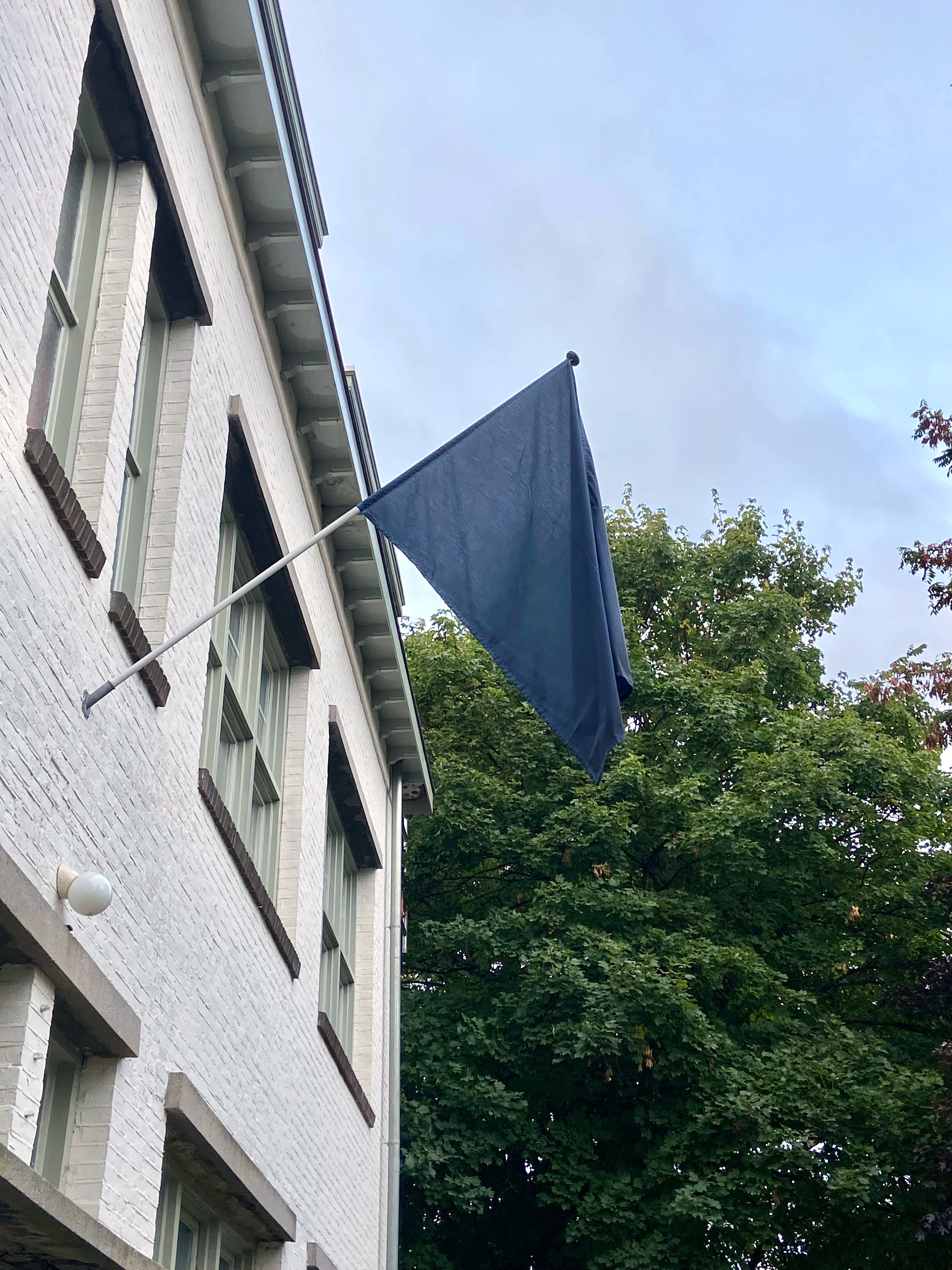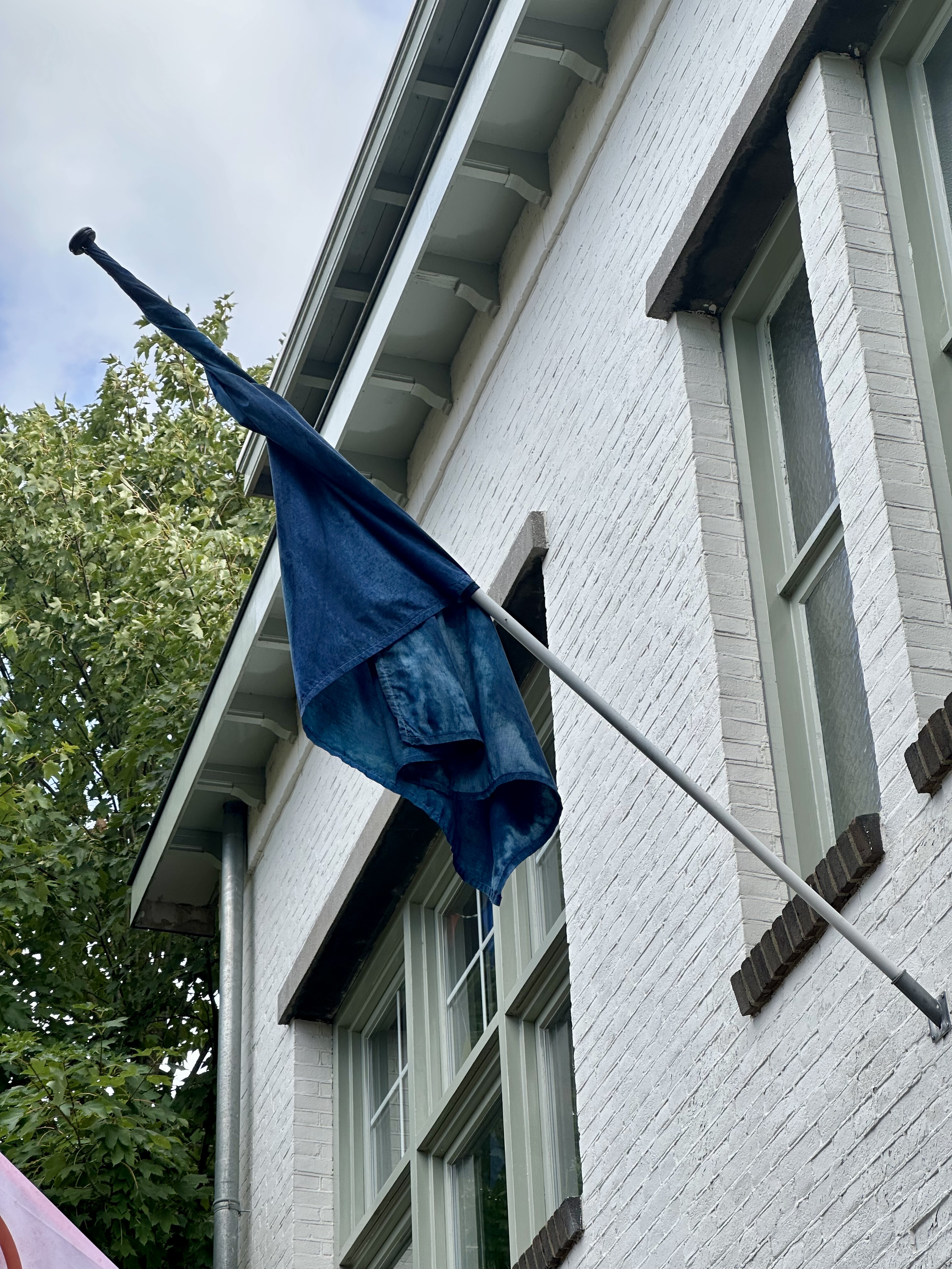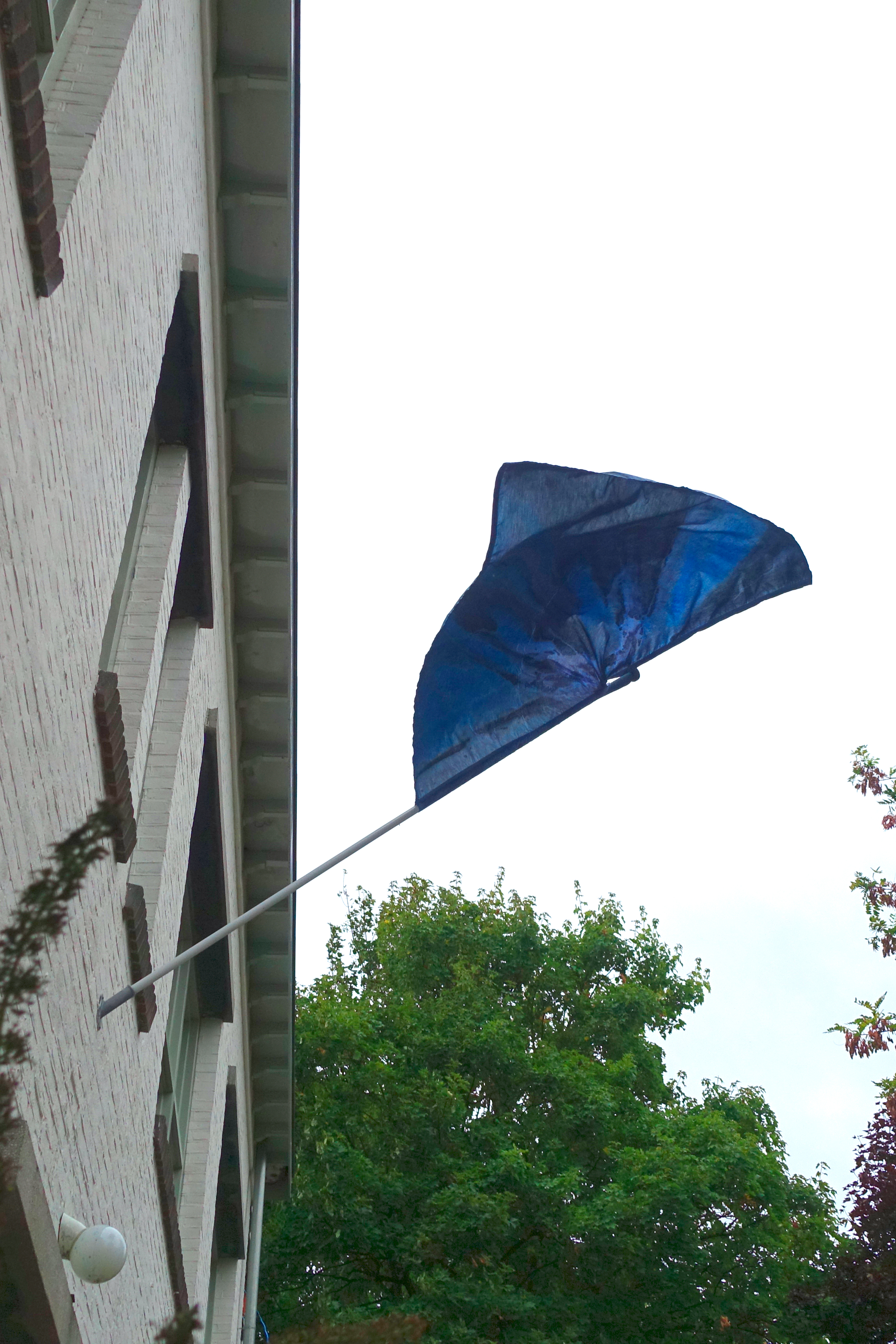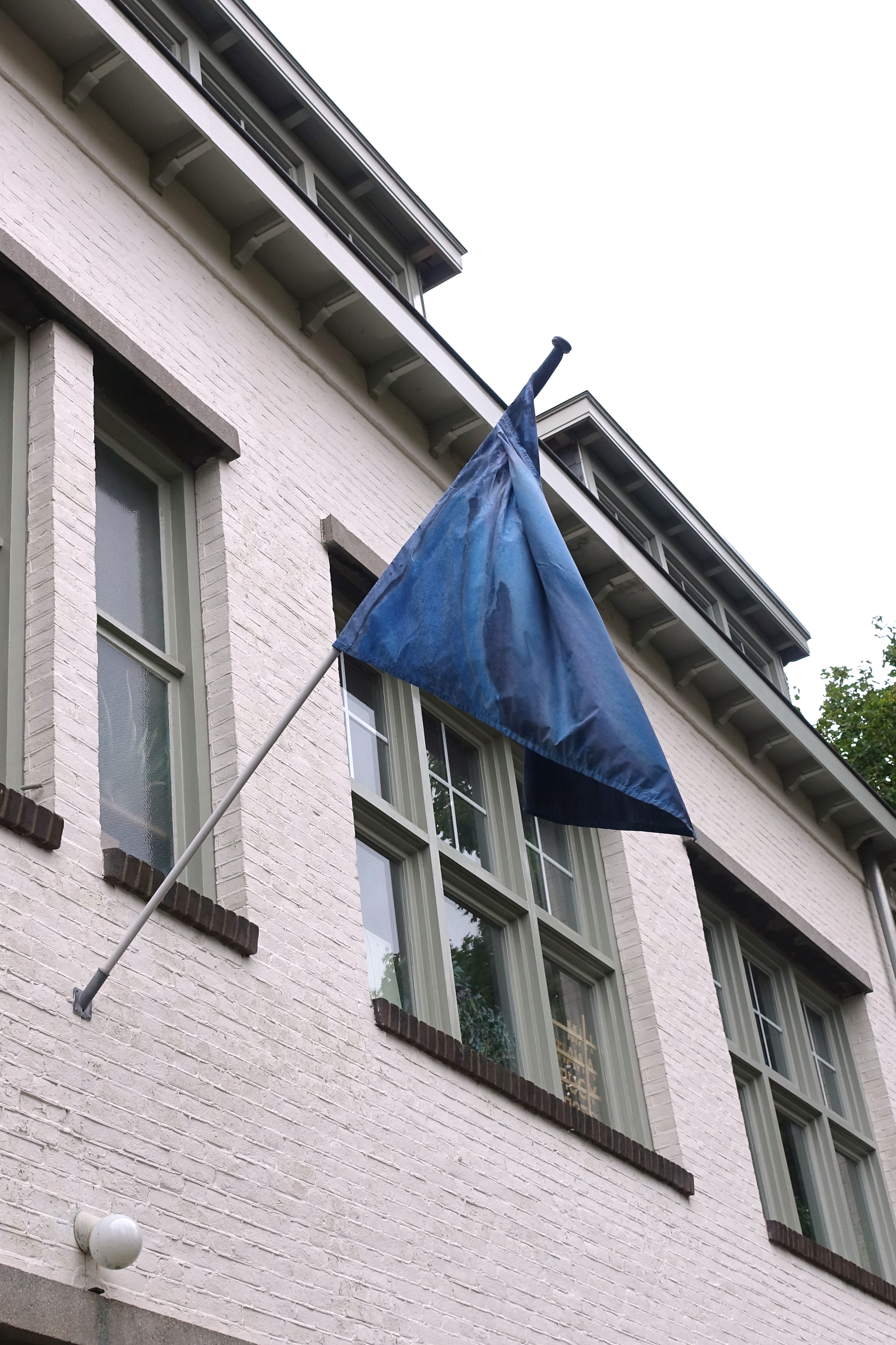 Eine Flagge symbolisiert normalerweise die Manifestation einer bestimmten Herkunft, eines Ortes oder einer Zugehörigkeit. Diese Flagge existiert einzig, um zu der Umgebung zu gehören, in der sie gehisst wurde. Sie wirkt wie ein Spiegel – nicht in Echtzeit, sondern als Dokument ihrer ersten Begegnung mit Licht. Dieser Moment, allein durch natürliche Einflüsse gesteuert, endet mit der ersten Berührung des Regens. Die Flagge ist mit Cyanotypie beschichtet: Im Dunkeln sensibilisiert, beginnt sie sich zu verändern, sobald sie gehisst und dem Tageslicht ausgesetzt wird. Der Wind bestimmt, wie viel Fläche Licht einfängt, während in Falten liegende Teile des Stoffs unbelichtet und dadurch wasserlöslich bleiben. In ihrem unkontrollierbaren Erscheinungsbild einer stillen Zusammenarbeit zwischen menschlicher Intention und natürlicher Geste stellt die Flagge ein Sich-Heranwagen und ein Verstehen des Gegebenen dar. In ihrer materiellen Präsenz ist sie zugleich Ausdruck und Zeugnis dieses Moments der Verbundenheit. Das Werk entsteht ortsspezifisch und wird für jeden Standort erneut gefertigt, beschichtet und belichtet.