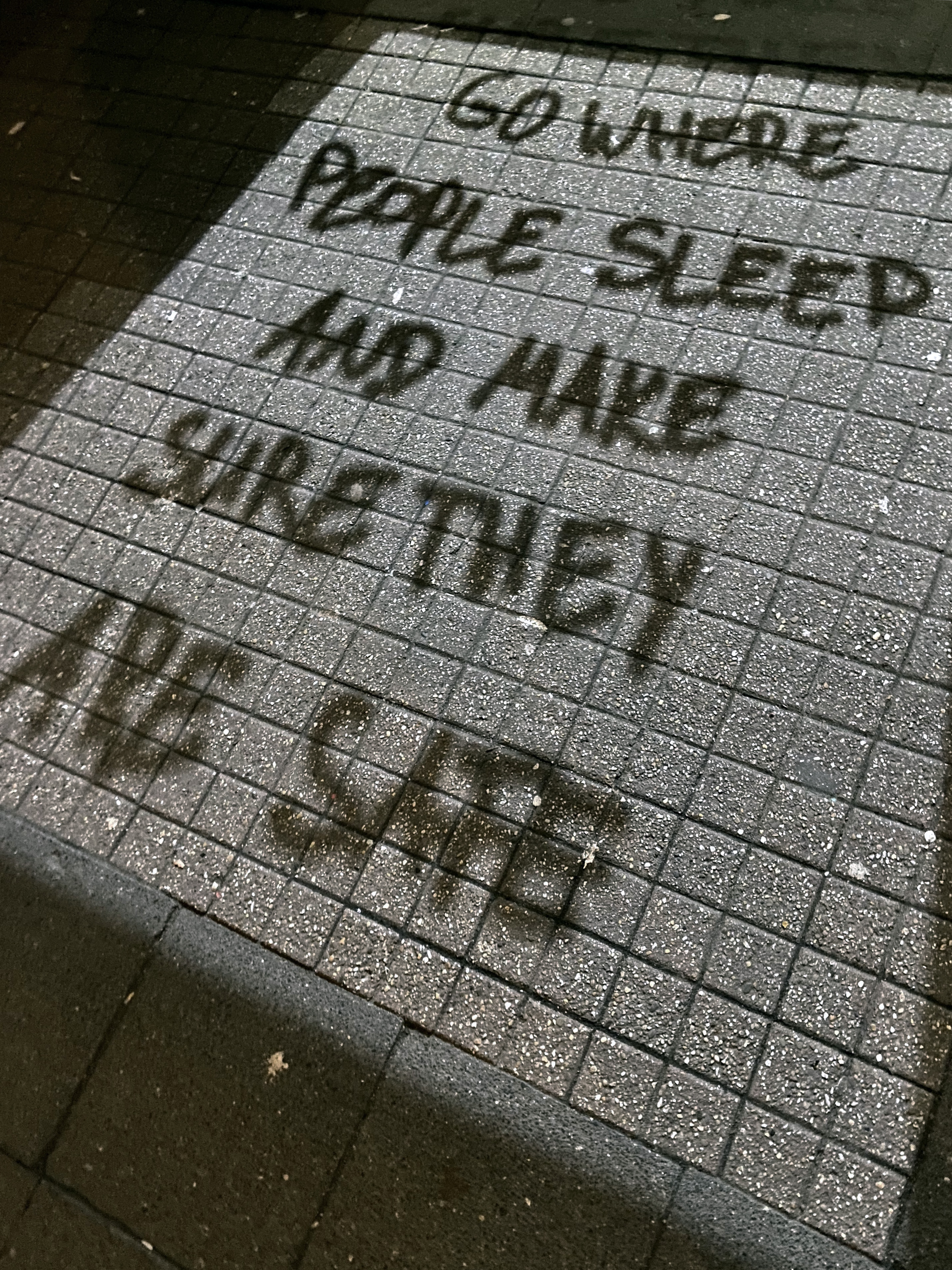 In einer fortlaufenden Recherche beschäftige ich mich damit, wie nächtliche Bedingungen das Gefühl von Sicherheit beeinflussen und verbinde dies mit meinen eigenen Ängsten in einer Reihe von Arbeiten. In (halb-)öffentlichen städtischen Räumen werden Passant*innen mit projizierten Textaussagen konfrontiert, die zu wechselseitigen Handlungen der Fürsorge auffordern. Die Sätze verlangen einerseits, die Sicherheit anderer Menschen in der Nacht zu gewährleisten und möchten zugleich einen Dialog über die eigene Beziehung zur nächtlichen Sicherheit entfachen. Die Installation ist von Natur aus ortsgebunden, da sie an Orten platziert ist, die für einen verletzlichen Körper, der nachts allein unterwegs ist, als bedenklich verstanden werden können. Die sich ständig verändernde Sichtbarkeit der Projektion bei Tag und Nacht durch natürliche und künstliche Lichtverhältnisse unterstreicht die Dringlichkeit der Aussage im jeweiligen Kontext.