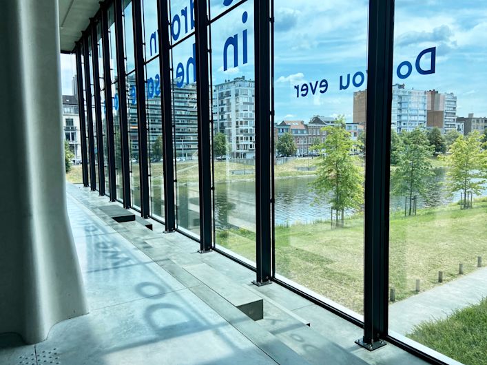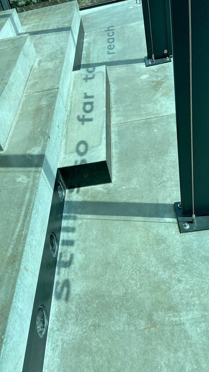 While efficiency, success or performance may be worn proudly in our society as a sign of reliability, it is not always easy to publicly display our limitations and uncertainties. Alicia Kremser’s artwork transforms the exhibition space, the museum, into a place of openness and shared intimacy. A simple phrase activated by the sunlight, a shadow that appears and disappears every day, blending in with the architecture and inviting the visitors to question themselves on the perception of the place. Creating a direct and still subtle interconnection with the viewer, the in-situ installation is in itself based on the fragility and fugacity of the moment as a metaphor of our social interactions. Alicia Kremser’s artworks lead us to reconsider the way we shape each other’s lives by placing us in front of what looks like a coincidence of “being at the right place at the right time”. The message of the sentence is directly addressed to us. In doing so, the artist materializes her own feelings and thoughts, transforming a silent public space into a safe place where to express our deeper self and extend our ability to listen and pay attention to the “Other”.